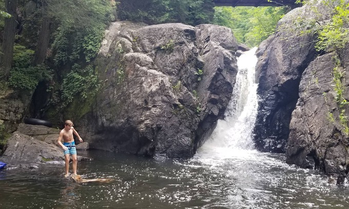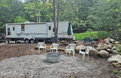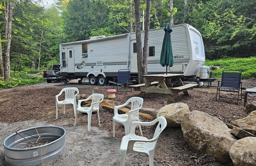 UNPLUG (NO INTERNET OR CELL SERVICE) at "Davey Falls." Nestled in ADK on dead-end road. Currently located next to the Barn. . A 32' fully loaded Cherokee Camper (Sleeps 6). View of Putnam Creek 100 yards from Private Waterfall, swimming Hole & nature trails. Centrally located in Adirondacks. Short Drive 5 -20 Min to ADK 5 Lakes, Dozens of Hiking trails & Amazing Historic sites, Grocery stores,Restaurants. . Large fire pit, gas grill, sundeck overlooking swimming hole. Kayaks & canoes are available for fee upon request. A deck overlooking the river,.picnic table, fire pit.