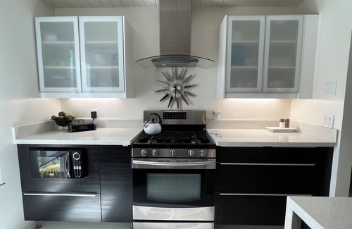 Spacious kitchen is all new: quartz counters, cabinets, appliances, including utensils and small appliances, even a yogurt/ice cream maker! Island with a quartz counter top is a popular place to gather with 6 adjustable bar stools.