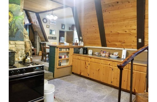 Being an A-Frame, the upstairs bedroom/loft is much warmer than downstairs, especially in the winter. There are fans on both levels to encourage circulation of heat from the propane vent-less heater.