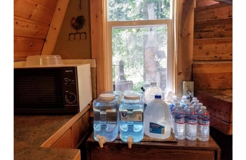 Just to reiterate, the plumbing inside the cabin is outgoing only. Water must be brought into the cabin from the creek or it will be provided in buckets and large water jugs (if the creek is not running, which it occasionally does not due to retainage for nearby forest fires or use in agriculture in the fall). Hot water is obtained by heating water on the propane range in the kitchen.