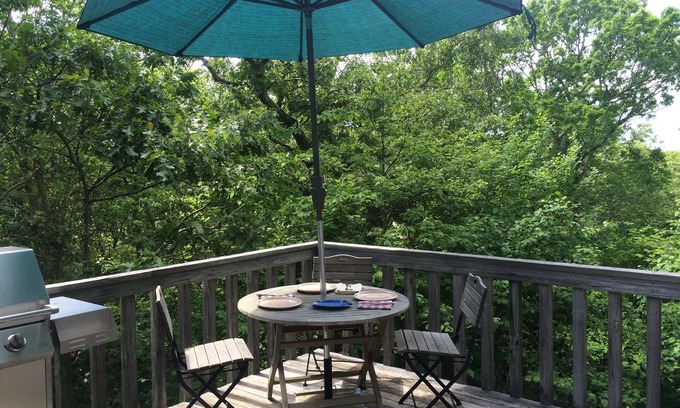Welcome to our getaway. The Up-Island Treehouse offers an open, light-filled and breezy spot on the western tip of Martha's Vineyard. Here you can relax and unwind in comfort and take your time to enjoy waterviews, birdsong and the pleasure of lazing a day away in a hammock. With decks on three levels, the house affords our guests time apart and time together; time in the sun and time in the shade. Our treehouse, as its name implies, is hidden in the trees and situated on 2 acres with old stone walls and a stream on the property. Guests enjoy lunches and dinners on the main deck,; sunsets on the roofdeck; an open and inviting master bedroom with full ensuite bath and easy proximity to Aquinnah's beaches. The house has 2 bedrooms and 1 1/2 baths. The master loft boasts a Schifman queen and quality linens and the first level boasts a well-placed open air outdoor shower that our guests describe as special. The house is biking distance to all Gay Head beaches and includes permission to access Philbin Beach passes. Wifi is included.