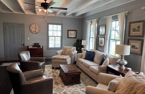 Relax in this historic 1880's farmhouse nestled on a working cattle ranch just minutes from town. The home is a pleasant mix of antique charm and modern amenities such as the recently remodeled bathrooms and full chef's kitchen with stainless steel appliances. The owners live on the property in a separate residence, just a text away. Enjoy your escape to the country after antiquing at Round Top, or touring the famous Painted Churches. The property is conveniently located near The Oaks at High Hill and Svetlik Farm wedding venues and one mile from Freyburg Hall.