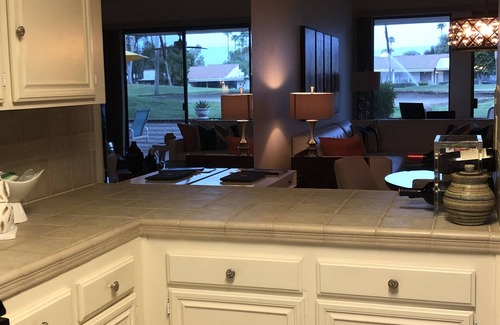 Relax in our remodeled two bedroom vacation home located in the Rancho Las Palmas Country Club. The back patio is on a green and has a fantastic golf course views. The condo is also just steps away from a swimming pool and Jacuzzi. Must be 30 years old to rent this property.