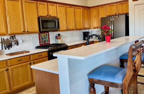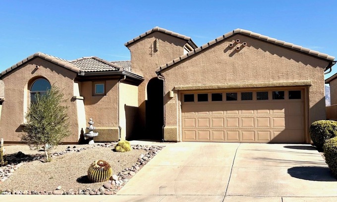Make yourself at home in this lovely 3-bedroom Green Valley retreat. Beautiful updated kitchen with quartz countertops, newer appliances, and unique charming tile backsplash. This brilliant house features 1 king bed, 1 queen bed, and 1 sofa bed, perfect for a comfortable stay. With 2 bathrooms equipped with showers and hair dryer, guests can freshen up with ease. Enjoy the convenience of other amenities like an iron, heating, AC, washing machine, two TVs, streaming, and WiFi. We hope you'll enjoy your stay at our house. Enjoy a private backyard oasis with amazing views of the Santa Rita mountains while listening to the waterfall. Gas grill, comfortable patio furniture. Spacious 2-car garage with workbench and storage. Just a short walk to the Canoa Terrace GVR facility with an indoor pool, gym, pickleball courts and tennis courts. 5-minute walk to Canoa Ranch Golf
