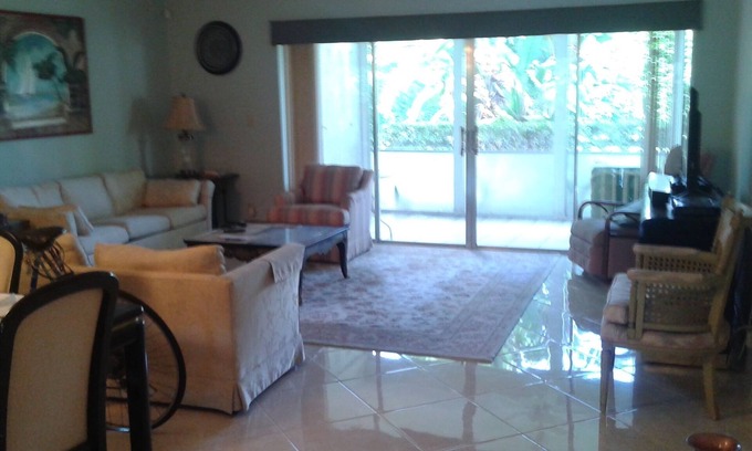 Lovely 1220 SF 2/2 BR minutes from downtown Delray Beach. Spacious eat-in renovated kitchen with granite counter tops and shaker style cabinets. Spa-like bathrooms. Serene garden view from screened in patio. Flat screen TV in living room. Tile throughout. Short walk to clubhouse, pool, tennis, billiards, hot tub and clubs. Enjoy Delray Beach's culture, art, beach, dining, shopping, entertainment and tennis matches. Twelve minute ride to the beach!!