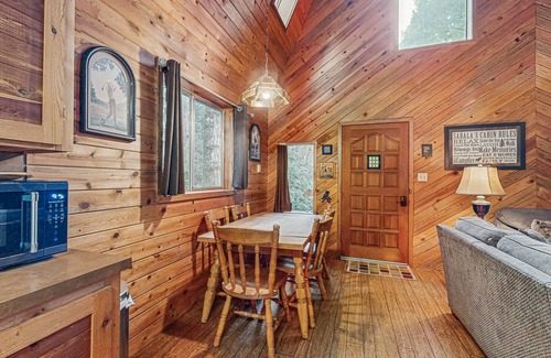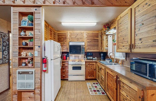 This home has a classic cabin-in-the-woods aesthetic with wood ceilings, floors, and walls, a cozy wood-burning stove, and outdoor-inspired decor. Updated for the modern age, it also features a cable television (with a DVD player and a home library of DVDs to choose from), standard kitchen appliances, and a gas grill for barbecues. There's also free WiFi.