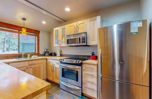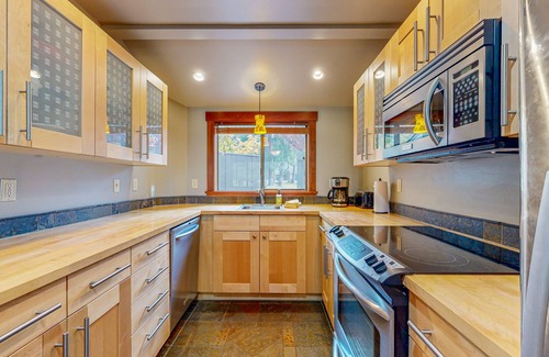 Back at your stay, get cozy amidst the comfortable living room seating while you stream your favorite TV show or engage in some competition over a board game. The updated kitchen is well-equipped with stainless steel appliances and wooden countertops. Off this space, you'll have access to a private washer/dryer.
