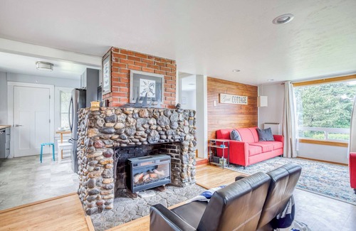 Perched on a bluff near Alsea Bay, Whale’s Cove is an adorable, classic sea cottage in a quiet neighborhood that looks out over the estuary and the water. With ocean views from many rooms, a rustic river-rock fireplace, and a sweet wood-lined interior, this vintage cottage also sports some wonderful updates, including a new kitchen and remodeled bathrooms. Two red sofas invite conversation in the living room, where large windows bring in lots of ocean light. Another sofa faces the electric fireplace for fire-gazing on chilly nights. A trestle dining table in the kitchen and an extendable Gateleg table in the living room make eating in a pleasure. A queen bedroom on the main level has its own TV. Upstairs is a small bonus room with a futon sofa, recliner and TV, plus a second bedroom tucked up under the eaves with a queen and twin bed, making this a great home to share with extra friends or family.