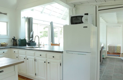 The cottage has an open floor plan with the kitchen opening into the living room. The large bedroom has 1 queen bed and an attached bathroom. This quaint