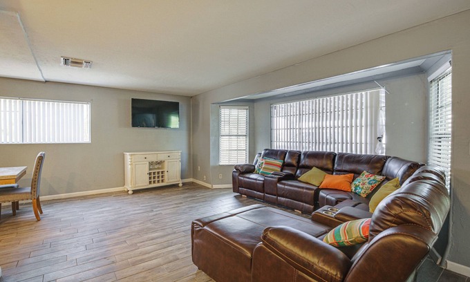 HOME HIGHLIGHTS: Smart TV, dining table, large sectional sofa, covered patio
