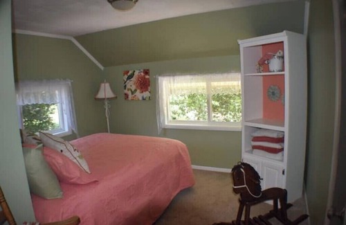 Remodeled 100 year old farmhouse with 3 bedrooms, one downstairs with a king bed and two upstairs with queen beds. Two full bathrooms, one downstairs and one upstairs. Large fully equipped kitchen with a dining nook and large dining table. Large laundry room with washer and dryer. Lovely bistro style patio for morning coffee. Barbecue for outdoor cooking. Cozy Living Room with large screen tv featuring Netflix and Prime. Office set up with keyboard, 19" screen and fast internet. Picnic tables in garden area for meals or morning coffee. Indoor toys and games for families and kids.