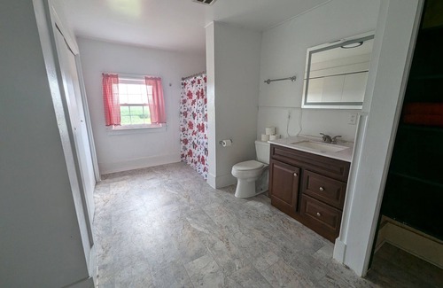 This updated farmhouse has modern amenities, including air conditioning. The home has three bedrooms upstairs, a bath and a half, a kitchen a washer and dryer, a living room, and a dining room. We're happy to assist with any questions while you stay at our farmhouse. Plenty of parking for a few cars.