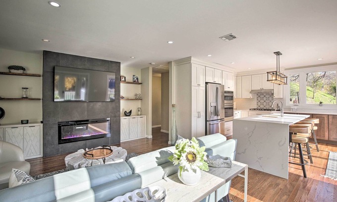 Relax, work, and recharge in style at this newly remodeled 2-bedroom, 2-bath vacation rental house in scenic Stony Point — perfect for extended stays and traveling professionals. With a dedicated office workspace, free WiFi, and a fully equipped kitchen, ‘Tranquility’ is ideal for remote work. Enjoy mountain views from the furnished patio, unwind by the electric fireplace, or explore the 2.5 wooded acres featuring a private stream, swimming hole, and peaceful walking space.