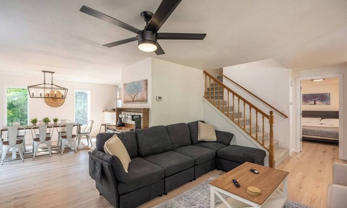 You’ll find ample seating throughout the home, with a full dining room table and comfortable living room setups upstairs and downstairs—perfect for gatherings and relaxation.