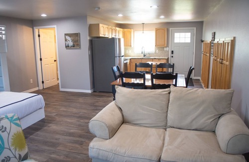 The 600 S.F. apartment has granite countertops, new stainless steel appliances, built-in beds, kitchen table, sitting area with TV, and air conditioning. There are 2 custom built queen beds with a twin bed above each. Perfect for 2 couples or families with kids. Plenty of space to spread out and enjoy your stay along with refrigerator, stove, oven, and microwave.