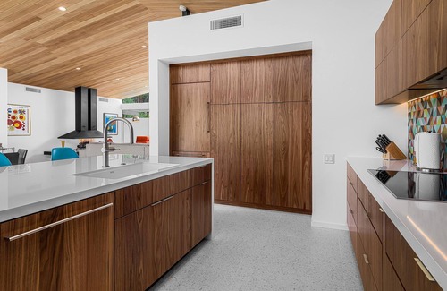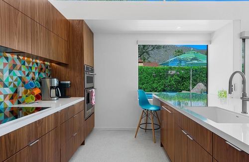 This 3 bedroom, 3.5 bath mid-century modern, solar-powered Palm Springs vacation home was originally built in 1956 and has been meticulously updated with contemporary finishes, stainless steel appliances and period furniture. It's the Palm Springs lifestyle personified. While adopting new finishes and functionality, the 2,476 sq ft home retains many mid-century architectural characteristics including tongue and groove wood ceilings, clerestory windows and an iconic mid-century modern floating fireplace. In addition, each bedroom has a King size bed and en suite bath.
