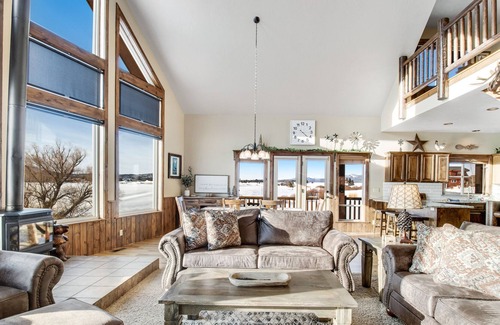 Massive windows frame the home's mountain views and provide strong natural light, while vaulted ceilings create an airy ambiance that complements the main floor's open layout. A gas fireplace anchors the great room and plush sofas offer a spot to kick your feet up while streaming shows and movies on one of the home's four smart TVs. The adjacent table welcomes family meals or game nights. Gorgeous countertops and a suite of stainless steel appliances will inspire culinary masterpieces in the kitchen.