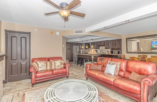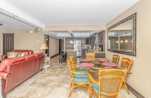 - Modern Amenities: The fully-equipped kitchen with stainless steel appliances and ample counter space allows you to prepare meals for your group, while the living area features a queen-sized sleeper sofa and fun arcade games for entertainment.