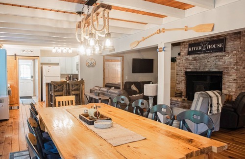 This updated cabin is designed for relaxation, featuring hardwood floors and beautiful decor throughout. The wood-burning fireplace and wall heaters ensure a warm and inviting atmosphere, while the tranquil sounds of the river create a soothing ambiance. For those seeking adventure, kayaks, floating tubes, and beach gear are available for your enjoyment, making it easy to explore the river at your leisure.