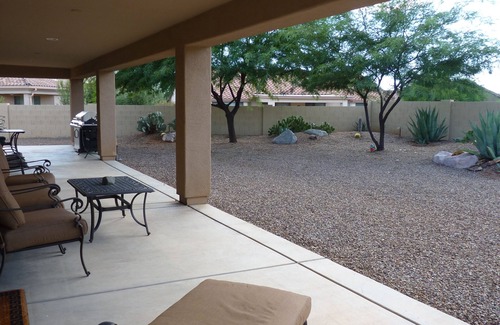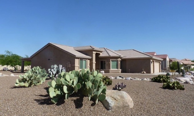 Our Laredo house is decorated throughout in the Southwestern tradition. The spacious master bedroom suite, second bedroom and living room have sliders out to the backyard patio. Enjoy a cup of coffee and beautiful sunrises with mountain views from the breakfast nook and third bedroom/office/den. Fantastic sunsets can be enjoyed in the backyard from the covered patio. The property is professionally landscaped and has soft automatic lighting. The walking paths are great for exercising or enjoying the scenery or rest on the benches and enjoy a sky full of stars as all of the lighting is underground. At dusk, it almost feels like you are in a private zoo. SaddleBrooke offers a lifestyle where you can enjoy life to the fullest or just sit back, relax, and enjoy all of the privacy this property provides!