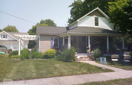 This is a upper 3 room studio Bed & Breakfast; Come stay in beautifully renovated 2 story home with beautiful gardens, fenced yard; relax on the sprawling covered porch or outdoor patios. Warm up in yard firepit. Farmhouse style interiors use original wood from the 1800s to compliment the style. All linens, dinnerware and gas grill included. Fenced yard, fire pit with wood and off street parking included as well as all utilities, cable and internet/wi fi . All inc. with any studio or whole house booking. Private. Great neighborhood close to beach, shopping and farmers market. Dogs welcome with additional fee. Kayaks on site. ($25. ea. per STAY) **Please note: This is a Studio, 3 room Bed & Breakfast with 1-2 dogs. Entire house is only available as a monthly or 3+ day rental. see Sweet Blu's for house availability. (7347405352). Pricing is for studio only.. Studio includes one bedroom, full bath, and sitting room/bedroom with kitchenette, tv and futon. Sleeps 4, and includes custom breakfast on Sat and Sunday mornings with weekend rental.. Lots of yard space to play games. Monthly studio rental starts at $3000.00/month plus pet/ cleaning fees Call for monthly whole house rental, or weekend availability. We are on Google. See more photos there.