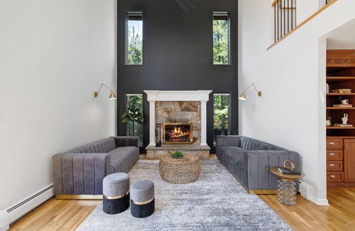 The living room space with two upholstered sofas is a comfortable place to hang out together and get cozy by the fire.