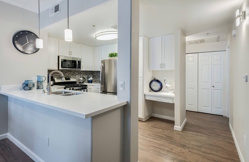 This two bedroom luxury apartment home features a gourmet kitchen with stainless steel appliances, high ceilings, air conditioning, a cozy gas fireplace, and a washer & dryer. You will be right at home relaxing on your own balcony.