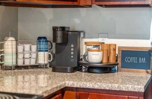 Kitchen is supplied with pots, pans, dishes, glasses, eating and cooking utensils. Enjoy a cup of coffee from the Keurig or filtered water from the Brita pitcher. Use the Instapot to prepare a meal or enjoy take out at the kitchen island or dining table. Dishwasher, oven, range, microwave and standard appliances for guests' use.