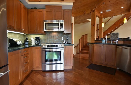 Additional amenities include a pool, a private 8-person hot tub, a surround sound system throughout the chalet, and more. The kitchen is fully equipped with stainless steel appliances. You'll also find a garburator, dishwasher,, phones and more. Relax on the two private decks, each furnished with comfortable chairs and tables. We provide all the towels and linens you need.