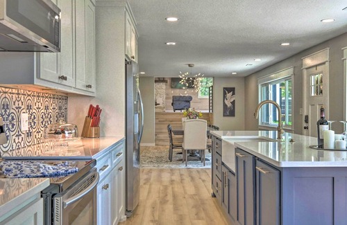 Sporting a sleek interior, views of the water, and immaculate outdoor space, this chic cottage is perfect for families visiting Beaver Lake!