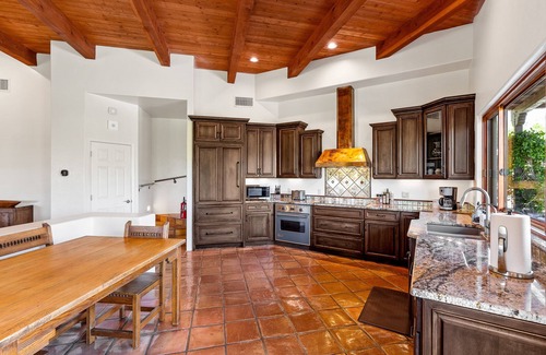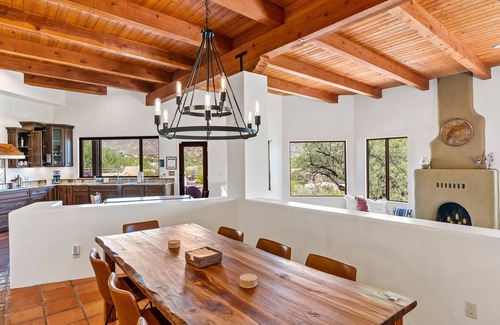 Casa Catalina is your perfect upscale desert getaway. Relax by the pool while taking in the stunning Catalina mountain views. Located on a 1-acre lot, surrounded by the peaceful desert landscape. This desert oasis has gorgeous textures, soaring ceilings with rich wood beams and charming saltillo tile. Newly remodeled, this resort like home’s multiple indoor and outdoor living areas provide you with plenty of space for vacation in the desert sunshine. Spacious Chef’s kitchen with high-end appliances including Viking induction cooktop, Subzero refrigerator and Dacor built-in BBQ. After a fun filled day, gaze at the star-studded night sky, while soaking in the therapeutic heat of the hot tub.