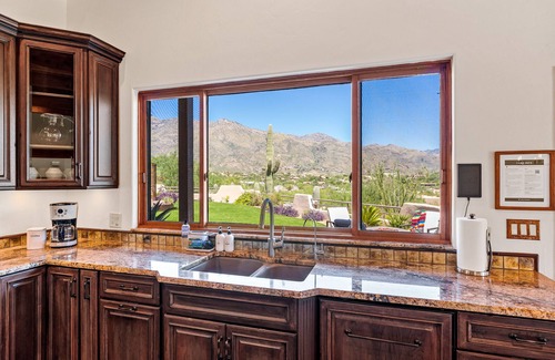 The backyard offers incredible views of the Catalina mountains, which often turn pink at sunset. Dine al fresco, enjoy a glass of wine fireside at the gas fire pit or wood burning fireplace. For the working traveler, we’ve installed a WiFi extender so you can work outdoors while enjoying the desert landscape and million dollar views.