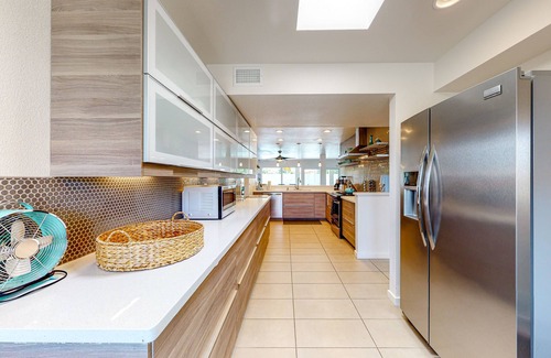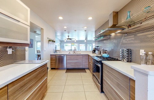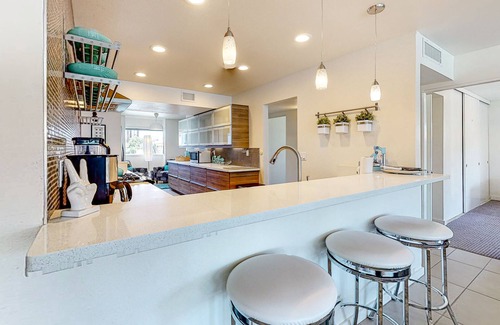 Walk through the front courtyard and push open the double burnt orange doors to get start your California getaway. The tile in the entryway continues into the sitting room with a chic gray L-shaped sectional, the perfect place for sipping cold drinks and enjoying good conversation.