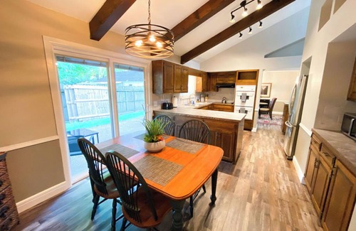Enjoy 1,700 sq ft of spacious comfort in this tastefully appointed home. Grand ceilings, a cozy fireplace, and ample seating ensure a delightful stay. The well-stocked kitchen invites you to cook, whether you prefer the casual breakfast nook or the formal dining area. Relax with comfortable beds, two smart TVs, unwind in one of the quaint outdoor spaces, or get productive in the dedicated workspace. Everything you need for a comfortable and convenient stay is here. Settle in and relax!