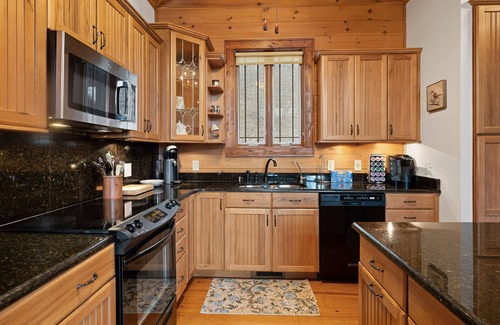 The kitchen and dining areas are adjacent to each other, with seating for for a full house. The kitchen is fully outfitted. A dramatic floor-to-ceiling stacked stone fireplace, centered between the kitchen and dining area and the great room, is open on both sides to be enjoyed from any of the spaces. The great room boasts leather furniture, wood floors, vaulted ceilings, a mounted TV, and a wall of windows revealing seasonal mountain views. Walk from the great room to the open-air rear deck, stretching from one end of the house to the other, to find the hot tub, outdoor lounge, and dining area. Enjoy wooded and seasonal winter mountain views, the rolling backyard, and the fire pit. Mature hardwoods surround Owl Ridge Retreat, giving it peace and privacy.