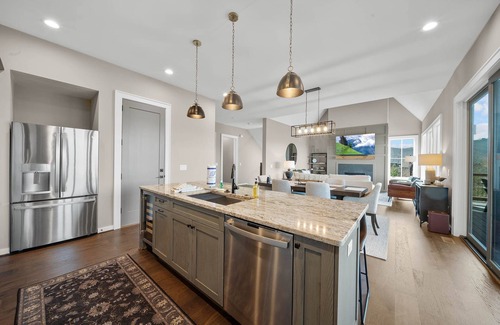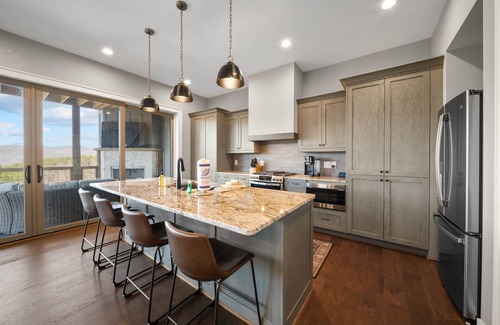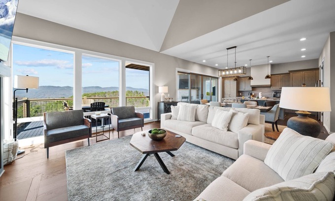 Experience luxurious comfort and refined decor while admiring breathtaking panoramic views of the Blue Ridge Mountains through the living room's expansive wall of windows or unwinding on the spacious deck with a Genesis grill, complete with a wood-burning fireplace and outdoor TV. With three well-appointed levels, this home offers ample space for every guest to unwind in comfort and privacy. The upper level features a quiet sitting area with stunning views, along with two bedrooms, each boasting a private ensuite bathroom. The lower level provides a spacious second living room and a secluded king bedroom with its own ensuite. On the main level, you'll find another luxurious king suite with a private bathroom, ensuring a restful retreat for all.