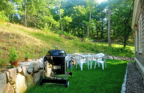 This little gem of a newly built cottage nestled on a secluded 10 acres, is situated one mile from Longnook Beach - the Cape's most beautiful semi-private ocean beach in the National Seashore Park. The Cottage is adjacent to The National Seashore Park and offers many secluded walks. Its cathedral ceilings and many windows overlooking abundant flower gardens gives a feeling of spaciousness and tranquility. The outdoor shower faces up to peach trees and hills. Private back patio as well as a charming front porch. Full living room, dining room and kitchen. Vegetable gardens galore! This cottage is fully winterized with radiant heat for year round use. One king bed, 2 twins in loft.