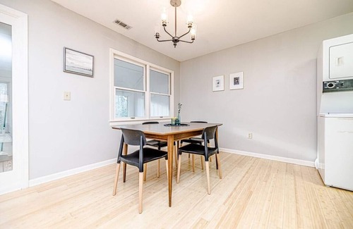The kitchen is fully stocked with spices, a KDUO (k cups/carafe), baking sheets, pots and pans, dishes, cooking utensils, olive oil, cookware. We will also have starter coffee available. The dining table has an additional 2 chairs to accommodate 6 people.