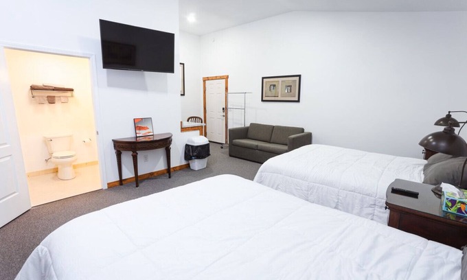 Unwind in our spacious 400-square-foot room, boasting two queen beds and a pullout sofa, ideal for families or groups. Every room has its own private bathroom and shower. Enjoy the convenience of modern amenities including a microwave, refrigerator, and smart TV, while the personal HVAC unit ensures your comfort year-round. With secure keypad entry, relax knowing your stay is both safe and convenient in our thoughtfully designed accommodations.