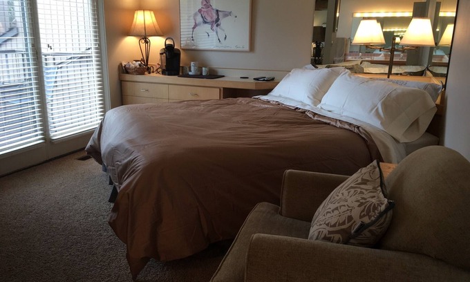 Upstairs Master Suite in Townhome on acclaimed Eagle Crest Resort in Redmond, OR. 450 sf with vaulted ceilings, lanai and beautiful outlook to the golf course. Very quiet and private. Coffee & tea service, mini frig, microwave, CAL King bed with luxury linens. Free wifi, desk space. TV with large channel selections; dvd and supply of some classic dvds. Shower, double vanity and separate Jacuzzi tub.