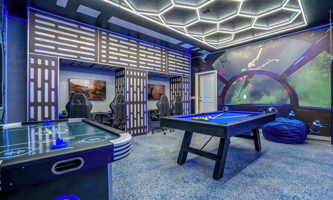 This pet-friendly 10BR mansion at Windsor Cay Resort is built for fun and relaxation. Enjoy a Star Wars game room, private movie theater, and screened patio with pool and Jacuzzi. Kids will love the Pixar bedroom with ball pit, plus immersive Frozen and Lion King rooms. With themed spaces, endless entertainment, and full access to Windsor Cay’s resort amenities, this home makes your Orlando getaway unforgettable.