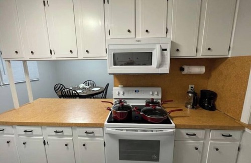Property features free wireless internet, 50 inch smart TV, kitchen is fully stocked with pots, pans, utensils, plates, bowls, cooking utensils, basic kitchen supplies for cooking such as salt, pepper, oil, foil, and you’ll always find a few non perishable food items to get you by until you get settled in. Plus a few baking pans as well. There is a coffee maker, filters, coffee and some condiments for you to enjoy and cold bottled spring water in the fridge.