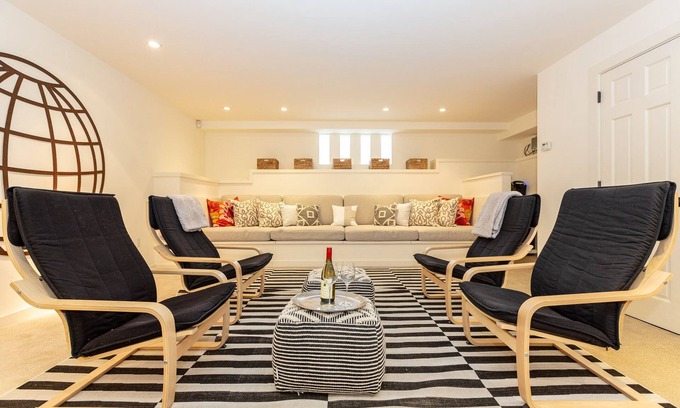 The apartment is accessed with a keyless pad through our garage and down an exterior garden stairway. The unit itself is accessed by a private entrance, but we do park in the garage so you will need to come and go through this common space. The apartment can accommodate up to four people comfortably. Living-room is spacious, with a luscious carpet and a cool-chic feel, big screen TV and huge built-in sofa that's great for lounging and getting comfortable after a long day of site seeing or work.