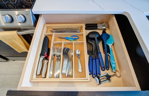Our studio guesthouse is located behind our primary residence in a tranquil and posh neighborhood, the Brookwood Estates. Our 500 sqft modern studio with aesthetic interiors comes with a fully functional kitchen with stainless steel appliances and is stocked with essentials to cook a full meal.