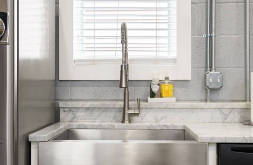 The open kitchen is modern and sleek, with stainless appliances and a stainless farmhouse sink. Smooth marble countertops stand out against the concrete brick backsplash.