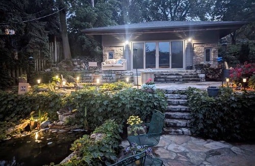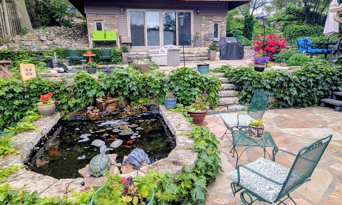 Enjoy the peacefulness in a serene setting. We have lots of garden spots and quiet spaces. Enjoy birds from woodpeckers to hummingbirds; dragonflies frequently visit the pond. Watching the fish is also fun. Our property is fenced in for your favorite four-legged friend to explore. On our property, we have had foxes, rabbits, owls, and even wild turkeys. If you want to sit around the fire and watch the fireflies, gaze at the stars at night, we have that available for you as well. Swing in a hammock or rock on a glider and make memories. Games are available such as cornhole, badminton, or a game of checkers.