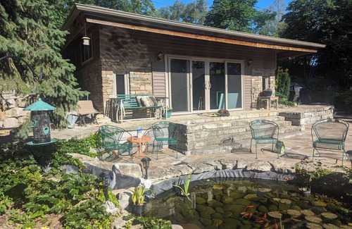 Escape to our charming guest house, a perfect blend of comfort and relaxation. Step outside to enjoy a peaceful patio with a soothing waterfall.