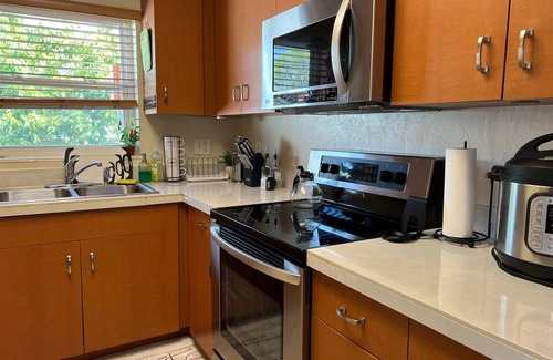A private lush tropical fruit garden view from a covered lanai with a grill and plenty of dining area. Located in a beautiful and eclectic Indian Beach Sapphire Shores neighborhood with mature green landscapes, the Ringling Museum, Asolo Theater, the Jungle Garden, a Bay park where dolphins and manatees are frequent visitors. 10 mins to downtown Sarasota, 12 mins to Lido beach and 20 min to Siesta beach. The ultimate Sarasota living awaits!