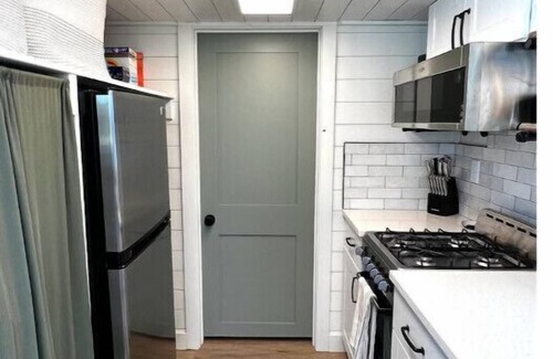 Our modern tiny home is the perfect retreat for your next getaway. This private 315 sq ft space is fully fenced for your exclusive use and boasts high-end appliances and furnishings.