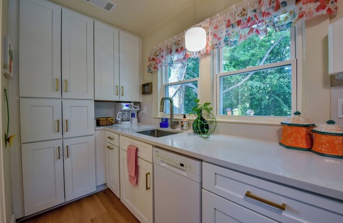This charming space boasts a comfy sofa and leather recliner in the living room with a curved smart TV. There's a desk area in case any remote work is necessary during your stay. The kitchen is fully stocked with a coffee maker and needed coffee supplies for a weekend, along with all the dishes and cooking items to easily accommodate four guests. The breakfast area has a dining table and seating for four. A washer/dryer unit and iron/ironing board are available for your use. There is a small front porch with a dining table with seating for four under a large umbrella along with a propane gas grill and a shaded backyard which also includes a gas fire pit and Adirondack seating for six - perfect for a game day Saturday or a relaxing afternoon. This is a pet friendly property and your well-behaved furry family member is welcome at Urban Treetop Cottage!